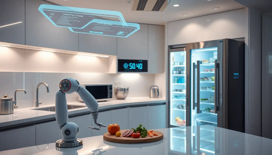 Futuristic kitchen with robotic arm, die besten Küchengeräte für modernes Kochen 2025.